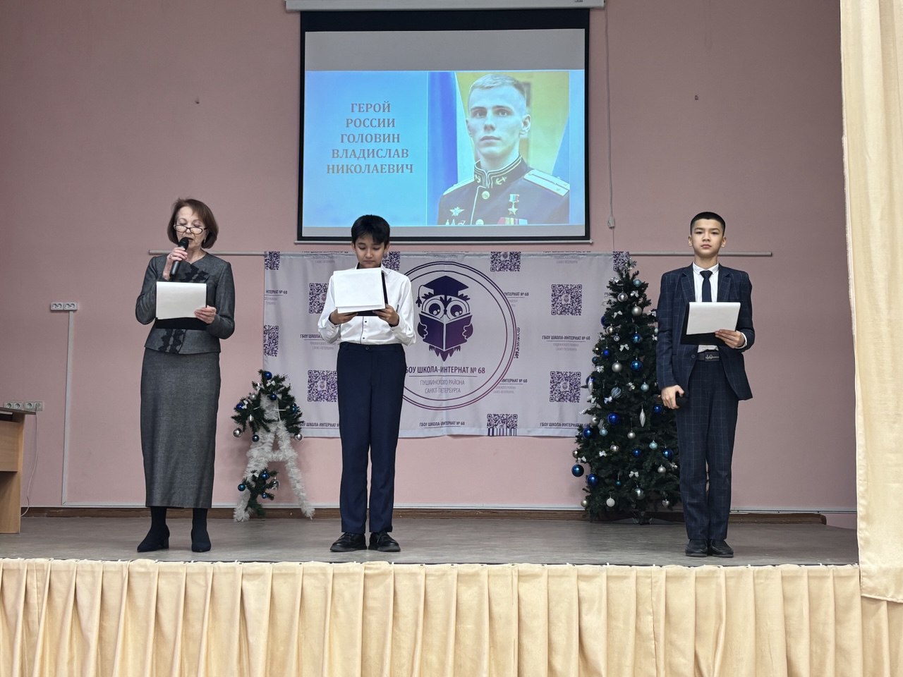 9 декабря, в актовом зале прошло общешкольное мероприятие в рамках Недели боевой славы, посвящённое Дню героев Отечества «Как становятся героями «Струна», подготовленное педагогом – организатором Вишневской И.В. Классный руководитель 7 класса Магомедова Р.Б., учащиеся Рустамов Шохжахон и Тошхужаев Бехрузбек рассказали о морпехе Владиславе Головине (позывной «Струна»)…