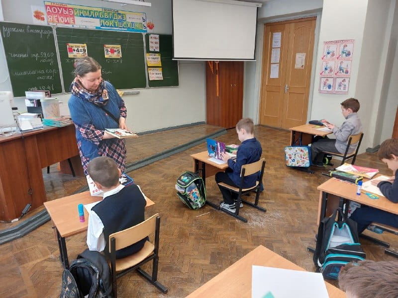 Встреча с учащимися второго класса школы-интерната №68 на тему «Зимние виды спорта». Дети посмотрели книги о зимних видах спорта и сделали бумажных лыжников…