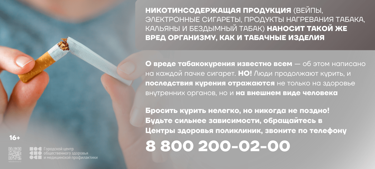 Городской центр здоровья предупреждает: все виды табака смертельно опасны. Электронные сигареты, вейпы и кальяны наносят такой же вред организму, как и обычные сигареты, вызывая зависимости и тяжелые болезни. Они также негативно влияют на социальную жизнь и продуктивность. Узнайте, где получить помощь в отказе от курения…