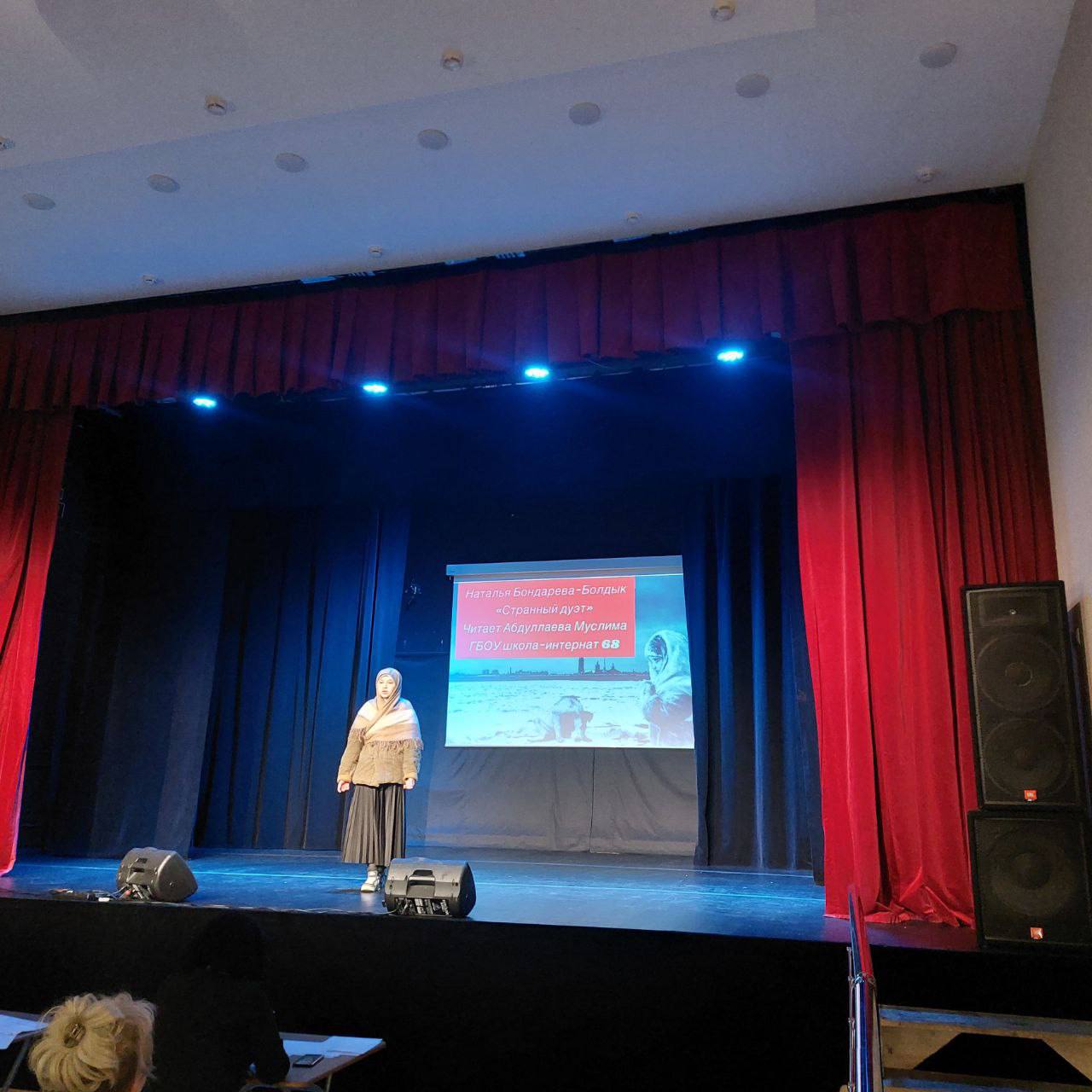 От нашей школы выступила Абдуллаева Муслима (педагог: Вишневская И. В.), финалистка отборочного тура. Она выступила со стихотворением «Странный дуэт». По результатам конкурса получила специальные дипломы от жюри «За эмоциональное воплощение темы блокадного Ленинграда».