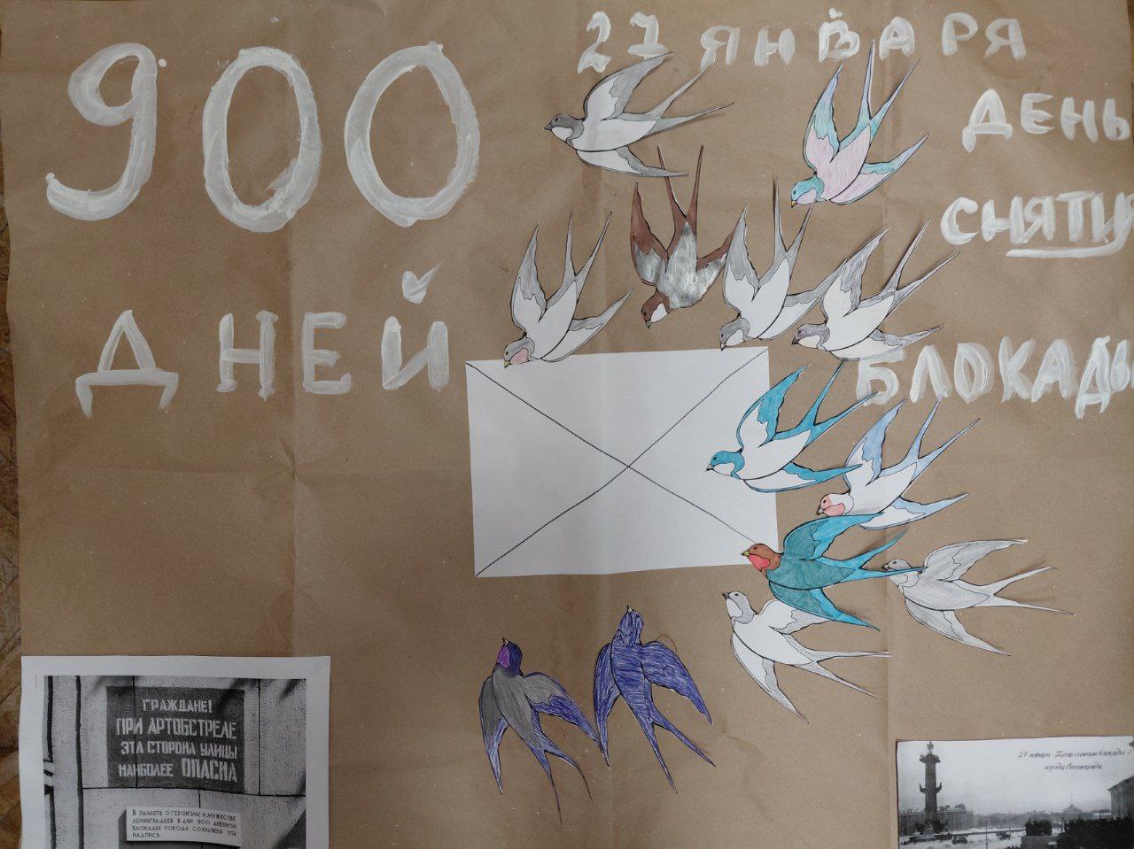 Для учащихся всех классов советник директора по воспитанию Кудрявцева А. Э. и классные руководители провели уроки мужества, совместно оформили плакат “900 дней”, посвящённый блокаде, вспоминали о героической обороне города, мужестве его жителей и обсуждали события того трагического периода с уважением к их стойкости и мужеству. Сложно представить, через какие нечеловеческие испытания прошли жители осаждённого Ленинграда.