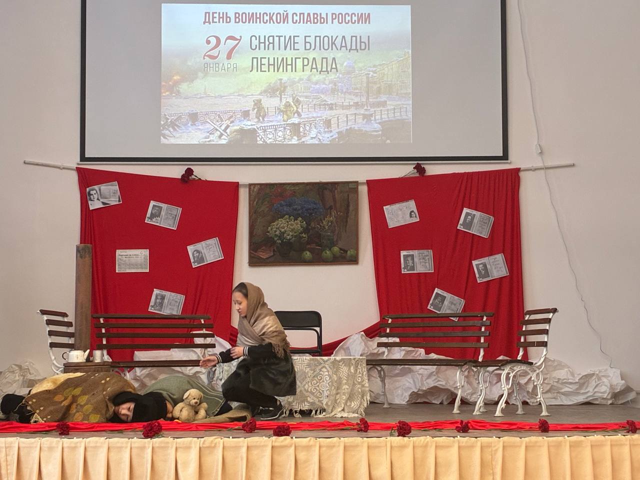 27 января, в рамках акции «Свеча памяти у Невы», участниками и педагогами 4–7 классов Магомедовой Р. Б., Барковской Ю. В., Зенковой Е. Ю. под руководством педагога-организатора Вишневской И. В. была подготовлена и проведена иммерсивная постановка, посвящённая истории трагической судьбы Тани Савичевой и её семьи в блокадном Ленинграде «В этих строках – блокада, голод, холод и страх…». В центре повествования — подлинная история ленинградской девочки, чьи краткие, страшные записи стали символом страданий детей блокады.