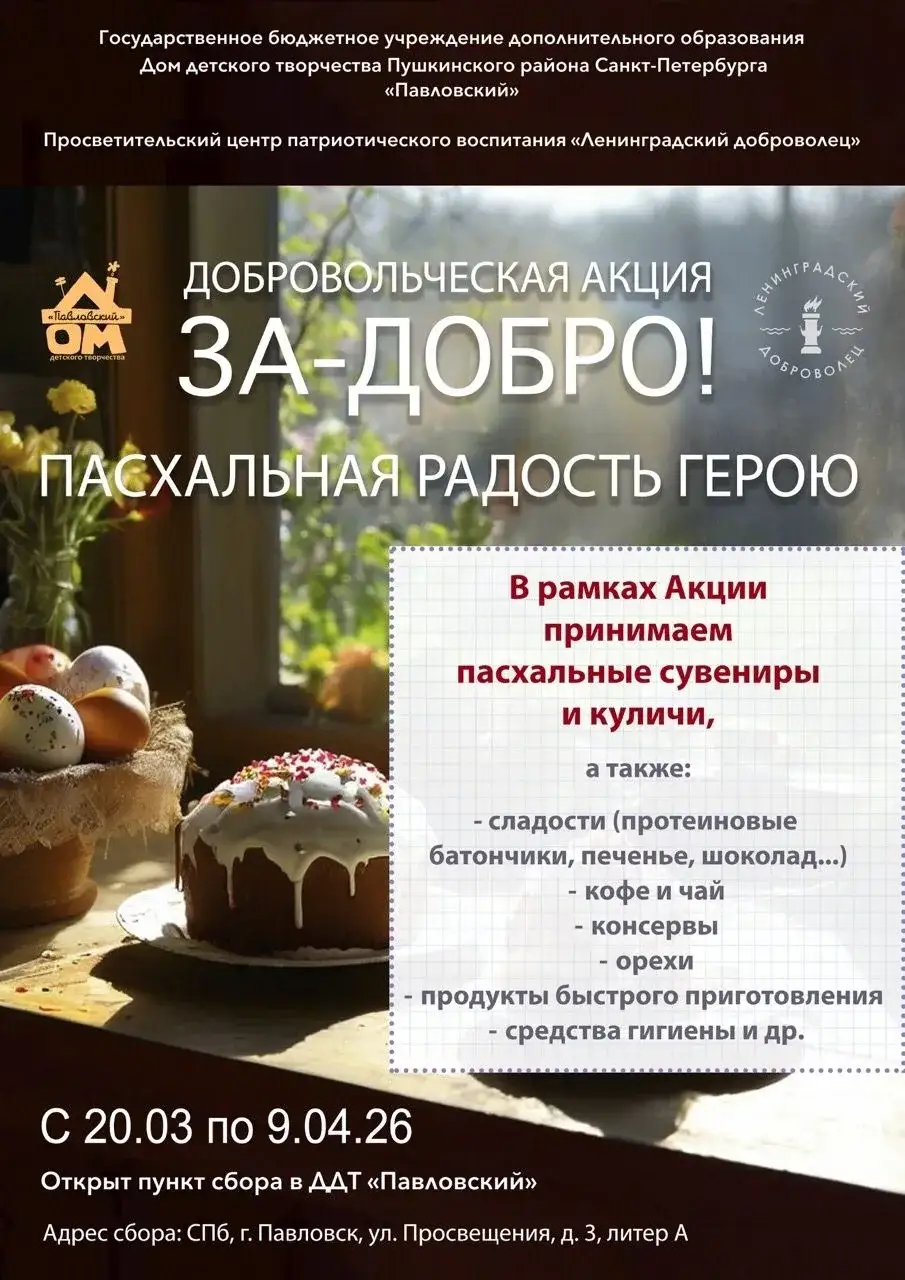26 марта учащиеся 6 класса вместе с классным руководителем Артемьевой И. В., по инициативе и при содействии педагога-организатора Вишневской И. В., приняли участие в районной добровольческой акции «За – добро!», «Пасхальная радость герою». Акция проходит в рамках проекта по гражданско-патриотическому воспитанию «Память поколений» совместно с Автономной некоммерческой организацией «Просветительский центр патриотического воспитания «Ленинградский доброволец», в поддержку военнослужащих, участвующих в СВО по демилитаризации и денацификации Украины.